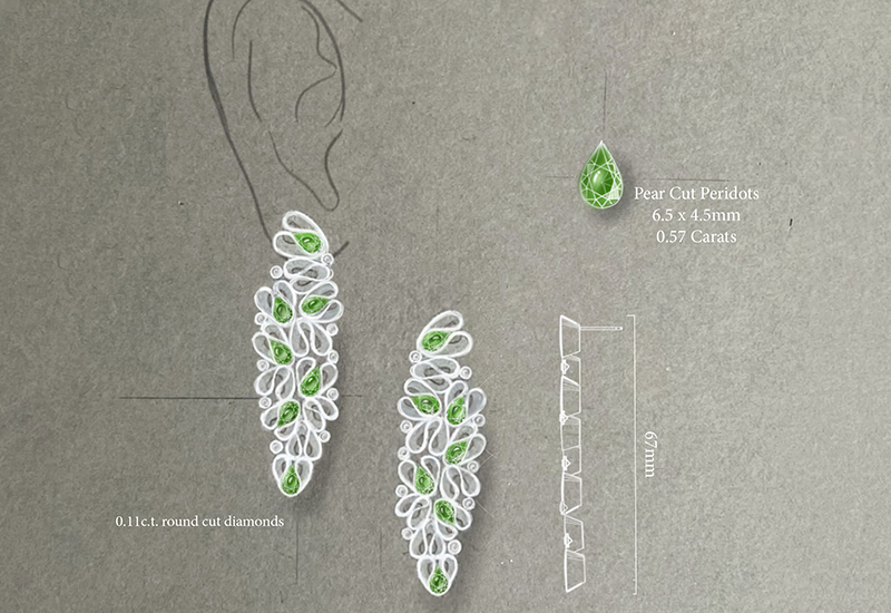 “In Hawaiian folklore, Peridots were believed to be the tears of the goddess of elements, Pele. They can also be found washed up on beaches, and hidden under sand,” explained Anita. “Because Peridots are often overlooked, I wanted my design to convey their hidden beauty – how they effortlessly capture the vivid hues of olive green. The earrings are designed in 18k white gold to highlight the colour of the Peridot gemstone and the earrings are shaped like a veil around the gems, alluding to its hidden nature.”